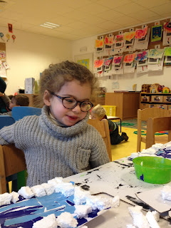 We experimenteerden met scheerschuim en tekenden daarin een sneeuwman, we schilderden met ijsblokjes, scheurden een pinguïn en nog zoveel meer.